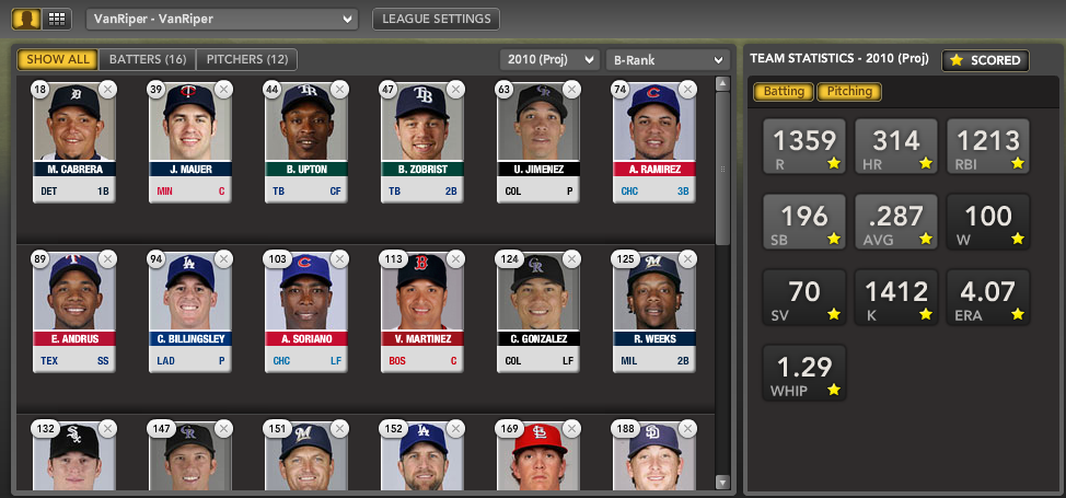 USA Today’s Steve Gardner did a fine job knocking his own efforts. He did manage to grab Ian Kinsler, David Wright, and Andrew McCutchen, as well as promising rookie Jason Heyward. Gardner’s offense is projected to finish with the second-fewest homers, runs scored, and runs batted in. His pitching staff expects to fare better, though, with Cliff Lee, John Lackey, and Rich Harden leading a staff that projects to finish third in wins.