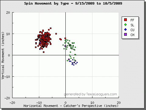 you get 67.7% fastballs – lower than last year. Look at all the non-red in there – he’s upped the changeup to 14.1% and the curveball to 6.0% while using the slider just about as much (12.2% this year).