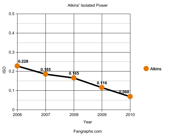 Atkins put up a stellar .228 ISO in 2006, but just a .116 ISO in 2009. To date, he is struggling to crack .100 in 2010.