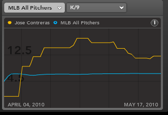 This season, Contreras has 18 Ks in 13.1 innings; a K/9 of 12.15. While the strikeouts have increased, the walks have declined. Contreras has shown decent control in his career with a walks per nine (BB/9) of 3.25. With just two walks in 2010, his BB/9 sits at 1.35 in the early stage of this season.