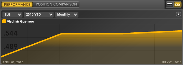 In May, Guerrero exploded for a .330 average, with 10 home runs and 31 RBI. His slugging percentage for the month was a stellar .633 in 109 at-bats. In June, he has added two more home runs and is once again slugging over .630.