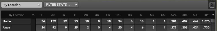 If you are looking for a fluke in his overall power numbers, you won’t find one. His .568 slugging percentage is identical to his career number. His .230 ISO is slightly lower than his .247 career average. In terms of batted ball data, his .322 batting average on balls in play (BABIP) is right in line with his career .319 BABIP. His line drives, groundballs, and flyballs are all within 2-3% of historical values.