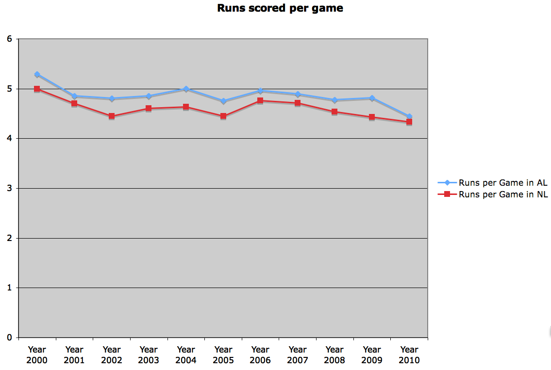 The National League has always been more hospitable for pitchers. NL pitchers get to face opposing pitchers in the lineup instead of a designated hitter. In each of the past 10 years, NL batters scored fewer runs per game than AL batters. (See chart).