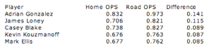 But check out just how badly playing in Oakland has hurt Ellis’ production these past few seasons. Here’s a look at the five players who have had the biggest OPS home-road split differences from the beginning of the 2007 season until today: