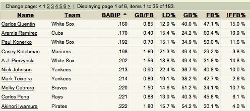 So there you have it. Feel good about Nick Johnson, Teixeira and Kotchman, and worry a little about Quentin and Aramis Ramirez in particular. BABIP is always a useful tool when looking at slumping batting averages, but xBABIP and its component stats help us complete the picture.