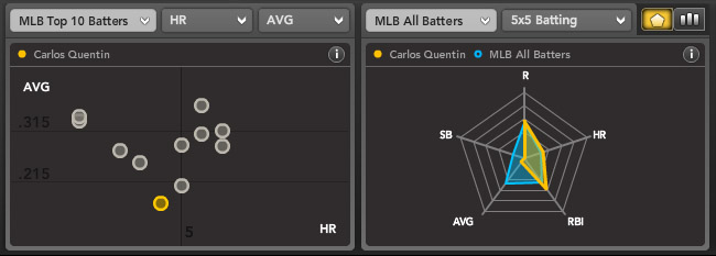 It’s nice how quickly you can get a sense of which of these players is more ready for a rebound in batting average than the rest. For example, Carlos Quentin may have something to worry about. He’s just not centering the ball, and with a poor line drive this year as well as over his career (15.7%), he may actually end up being a guy with power and poor batting averages once we look back on his full career. That’s another way of seeing how misleading batting average can be – even though we are more than 1500 plate appearances into Quentin’s career, there’s a non-zero chance that he’s better than his .248 career batting average so far. On the other hand, this spider graph from the Bloomberg Sports Fantasy Tools might actually show us who he really is.