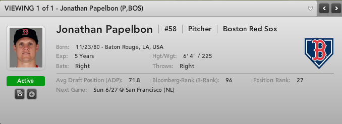 For more on Jonathan Papelbon and other Boston Red Sox, check out Bloomberg Sports’ Fantasy Tools