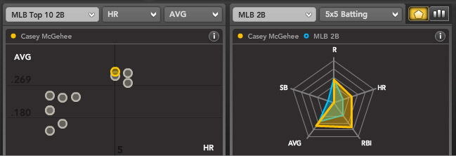 First, let’s appreciate how nicely McGehee is following up his debut season. Since McGehee is eligible at second base in most leagues, we can take a look at how he stacks up against other second sackers in the spider chart on the right from Bloomberg Sports Fantasy Tools. Sure, he’s not giving his owners many stolen bases, but otherwise he’s been more than solid. See those three dots clustered around McGehee in the scatter plot? They represent Dan Uggla, Chase Utley and Dustin Pedroia. Heady company for the young Brewer.