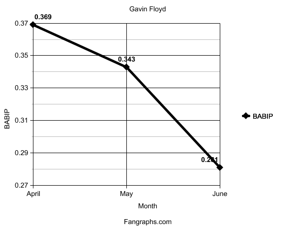 In conjunction with his LOB% regression, Floyd has seen a regression in terms of batting average on balls in play (BABIP). The league average BABIP is .302. In April, Floyd’s BABIP was .369. To date, his BABIP has dropped down to .322 — but it’s still well above his career mark of .295.