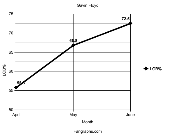 In early May, Eriq Gardner noted at Bloomberg Sports that Floyd was one of baseball’s “unlucky” pitchers due to a below-average left on-base percentage (LOB%), also known as strand rate. On average, pitchers strand 72% of men who reach base. For his career, Floyd has stranded 69% of baserunners.