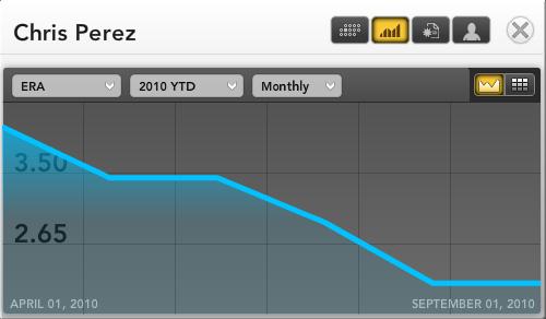 Perez was slated to start the 2010 season as the Tribe’s set-up man for Wood. When Wood went down with injury early in the season, Perez was temporarily given the closer’s role. Upon his return, Wood assumed control of the 9th inning. When Wood was traded to the Yankees at the July 31 deadline, Perez was once again given the title of closer.