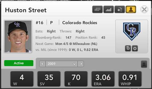 More likely, the Rockies will turn to left-handed former starting pitching prospect Franklin Morales to fill in for Street. Most baseball fans remember Morales, 24, as a promising rookie starter on the 2007 National League championship team. He dealt with a back injury and inconsistency in 2008, and had a shoulder problem of his own in 2009. Once healthy, he rejoined the Rockies as member of the bullpen. When Street went on the DL in September with biceps tendinitis, Morales closed out six games in his absence.