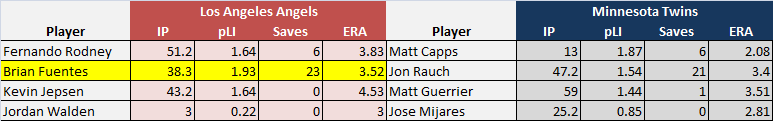 Below is a chart showing the Angels’ and Twins’ respective bullpens with innings pitched, leverage index (a statistic which measures the amount of pressure based on the base/state and score matrices; the higher the leverage score the more pressure-packed situations entered), saves, and earned run average. Logically, Rodney will be the Angels’ permanent closer for now, but keep an eye on Kevin Jepsen and Jordan Walden. Both have the ability to rack up strikeouts and with youth (and contract status) on their side, the Angels could very well be nearing a return to the homegrown closer model they enjoyed with Troy Percival and Francisco Rodriguez.