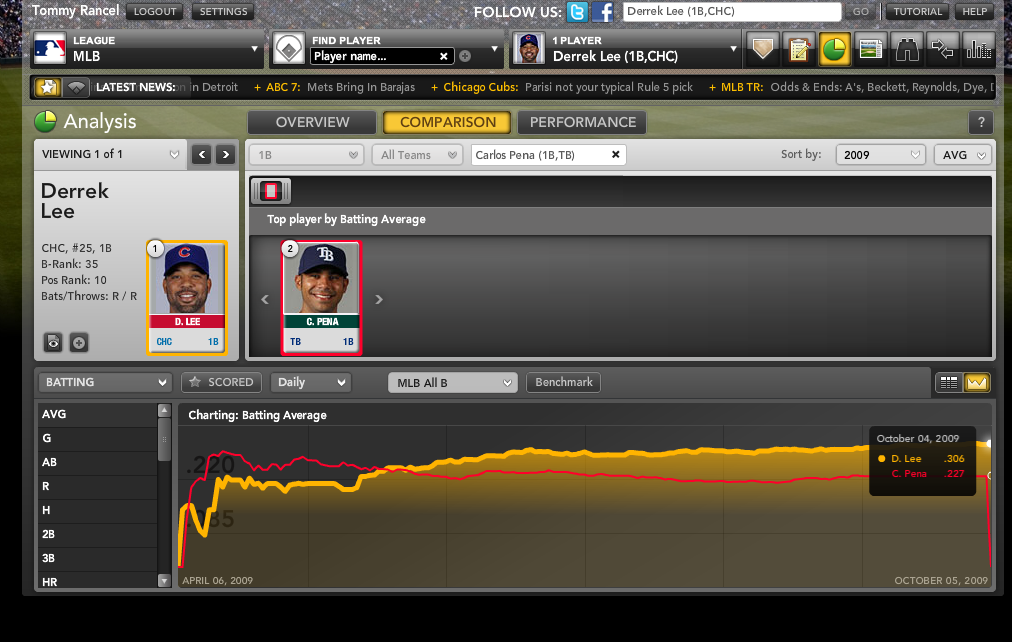 The dot nearly on top of Lee’s belongs to Carlos Pena. Pena’s value is nearly as high as Lee’s. If you can get either one you’ll be the benefactor of a big bargain. The reason to chose Lee over Pena is batting average. Looking at the trend line chart below, you can see just how big of a gap there is between the two in that category.