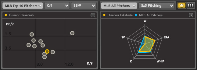 shelled for six runs in four innings. He followed that up with five runs allowed in five innings against the Marlins on Sunday. Now Takahashi is owned in only 12% of fantasy leagues and is probably on most waiver wires in mixed leagues. Will the real Takahashi stand up? The pitcher represented by the Bloomberg Sports Fantasy Tools spider graphs on the right is just barely fantasy relevant in shallow mixed leagues.