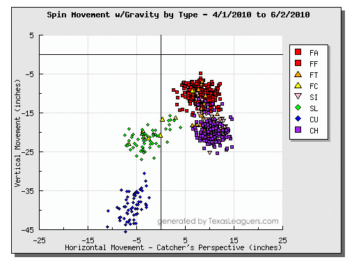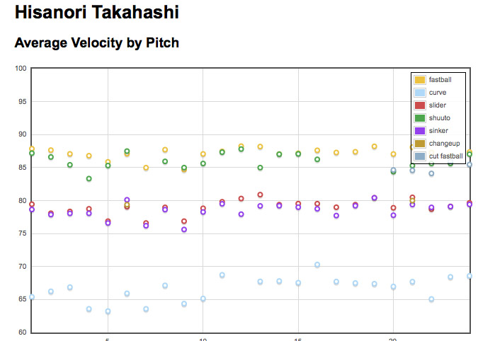 Does that jive with what we can see in pitch f/x for Takahashi? Fangraphs doesn’t have a pitch that seems to fit the description of a pitch with a similar velocity but different movement, but Texas Leaguers says that Takahashi throws a two-seamer 7.5% of the time. The two-seamer that Texas Leaguers describes crosses the plate at 81.5 MPH compared to his four-seam 88.6 MPH velocity, though, so it’s already a little different than most two-seamers. We know from Harry Pavlidis’ work with benchmarks for pitch types that the average four-seamer goes 92 MPH and the average two-seamer goes 91 MPH.