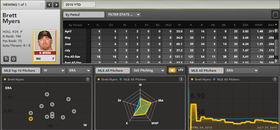Looking at Happ’s underlying statistics, there are plenty of reasons to worry about him in Houston. Just a peek at his 2010 strikeout rate (5.28 K/9) and walk rate (7.04 BB/9) alone should send the proverbial shiver down the spine. Happ has had some trouble finding the strike zone all year, as he walked 4.1 per nine on his rehab stint too. Granted, he’s pitched only 15.1 innings this year.