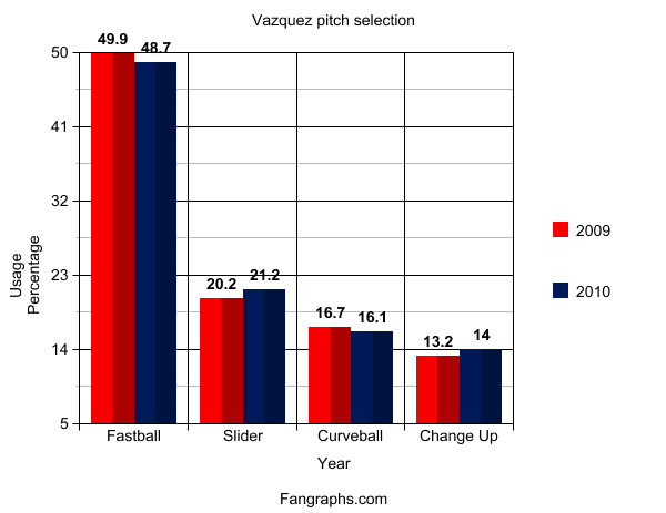 Throughout his career, Vazquez has maintained about 10.5 miles per hour on separation on the two pitches. This year, the separation difference is less than 8.5 MPH. His change-up velocity is within two-tenths of career level, but his fastball is down from 91.2 MPH (career) to 88.9 MPH (2010). A decrease of more than two miles per hour is probably the biggest cause for concern with Vazquez.
