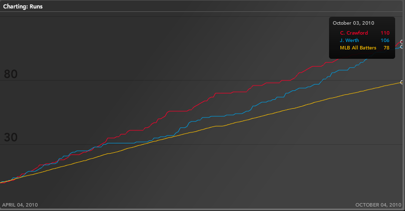 Looking at short-term value, Werth is likely the better offensive player for 2011 – even though Crawford is the superior fantasy commodity given his prodigious speed. Werth’s power potential is much greater, and it’s not just tied to balls leaving the yard. He led the league with 46 doubles in 2010 and could rack up even more in a place like Fenway Park. However, if you’re looking for a keeper between the two, Crawford is the one. He will continue to offer tremendous value in steals, as well as providing an above-average number of extra-base hits for the next few years. In conjunction with steals and extra bases, He should score a lot of runs in a good lineup as well.