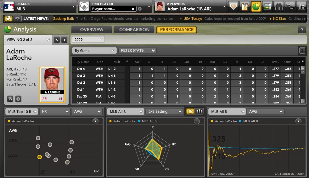 Using our Spider Chart, you can see that LaRoche derives most of his value from counting stats such as home runs, runs scored and RBI, with less value derived from his batting average and virtually none from stolen bases. At a glance, you can spot LaRoche’s 2009 totals in every category against other players major league-wide, or just other first basemen. His 25 home runs, for instance, placed just below the average of 27 homers for qualifying MLB starters at first base, well below the MLB-leading total of 47 at that position.