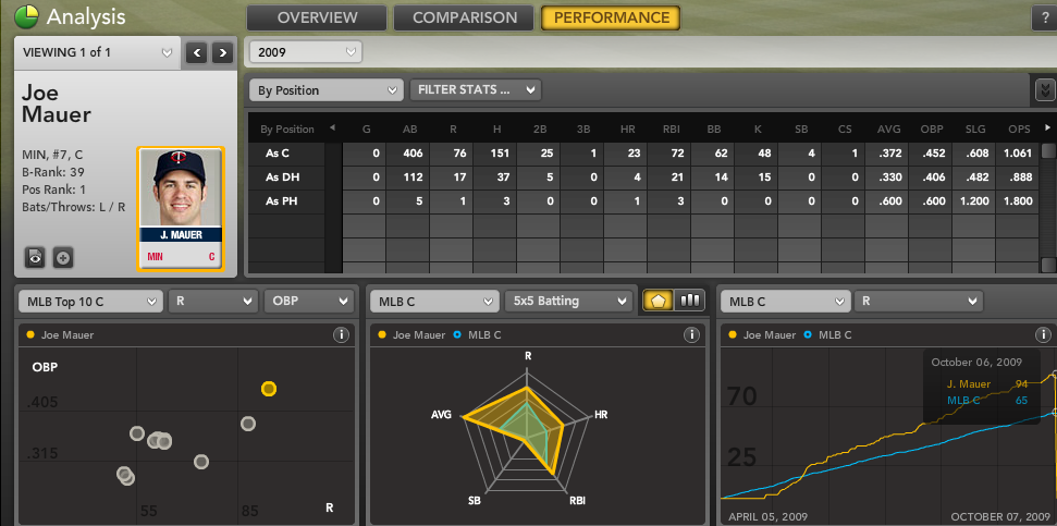 Among catchers, he’s a beast. Last year, he scored 30 more runs than the average Top-10 catcher. He did this despite missing the first month of the season. Here’s a graphical look at Mauer’s performance last year. Note, too, those 112 AB as a DH: