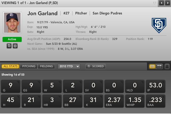 For more on Jon Garland and the surprising San Diego Padres, check out Bloomberg Sports’ Fantasy Tools.