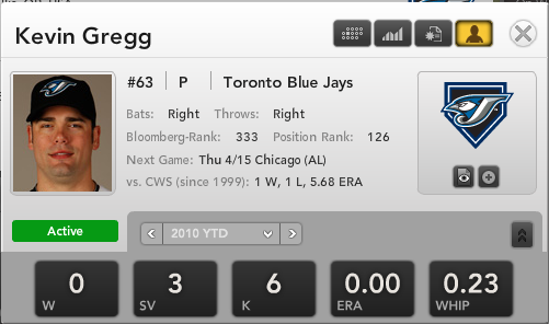 For more on Kevin Gregg and the Toronto Blue Jays check out Bloomberg Sports’ fantasy kits.