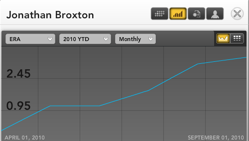 In 2010, Broxton is doing more of the same. His K/9 is once again hovering around 11.0 (11.41). His BB/9 (3.42) and HR/9 (0.38) are actually less than his career levels. His 2.37 FIP (fielding independent pitching) is the fifth best among National League closers.