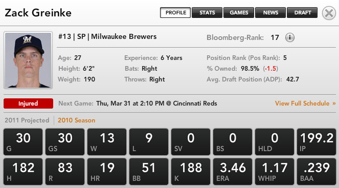 The first instinct is to take the team’s prognostications – that Greinke will miss only two-to-three starts – and say the whole thing is not a big deal. Just a few starts less from the ace, so you could drop him a couple points in the rankings and maybe pounce on him if he falls further than his third-round ADP (42.7 by the Bloomberg Sports Front Office tool).