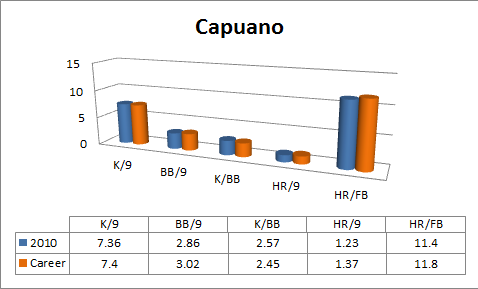 Because of injury, Capuano did not pitch in the major leagues in 2008 and 2009. In 2010, the lefty returned to make 24 appearances (9 starts) for the Brewers. In most cases, results immediately following major arm surgery should be taken with a grain of salt. On the other hand, in 66 innings of work Capuano appeared to be very much the same pitcher he was pre-operation.