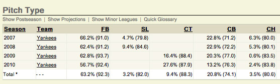 Throughout his career, Vazquez has maintained about 10.5 miles per hour on separation on the two pitches. This year, the separation difference is less than 8.5 MPH. His change-up velocity is within two-tenths of career level, but his fastball is down from 91.2 MPH (career) to 88.9 MPH (2010). A decrease of more than two miles per hour is probably the biggest cause for concern with Vazquez.