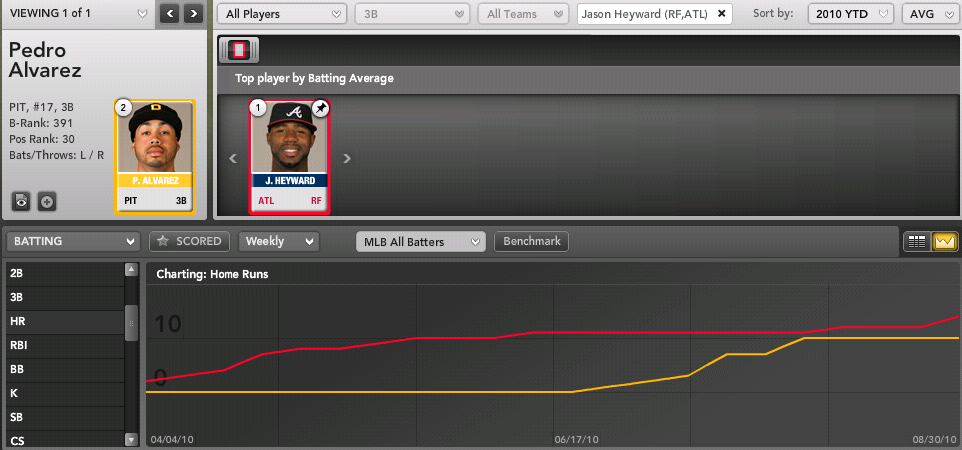 Going back to the Heyward comparison, Hotbox.com says the Braves rookie is owned in 77% of leagues – while Alvarez is owned is less than 5%. If you need some production down the stretch in a deep mixed or NL-only league, make sure you sneak Alvarez onto your roster before the playoffs start.