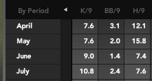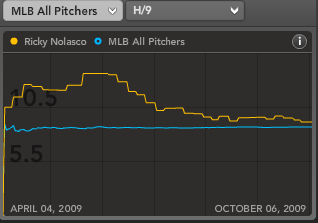 The increased FB% and a drop of two strikeouts per nine innings, to 7 from 9, indicates that batters were able to square up his pitches far more often then normal. Instead of hitters rolling over his breaking stuff and driving it into the ground, they were able to make more solid contact — and Nolasco struggled as a result. The Bloomberg Sports hits per nine innings chart (H/9) shows just how bad it got for him. At one point he was giving up five more hits than the league average. The H/9 chart also shows a strong correlation with the BABIP chart. This is a clear indication that what many thought was a run of bad luck, was also the result of bad pitching.