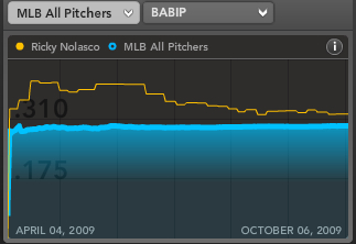 Some might see Nolasco’s extremely large jump in BABIP from .284 in 2008 to .336 in 2009 and his impressive FIP (Fielding Independent Pitching – a measure that runs on a similar scale to ERA but strips out factors such as defense, run and bullpen support) of 3.35 for the year as signs of a particularly unlucky season and thus expect regression to the mean this year. But there’s more to it than that. The key is to look at the splits.