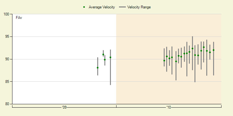 Bumgarner rode that improved velocity to an improved strikeout rate, ending the year at 6.97 K/9. Perhaps we focused too heavily on his strikeout rate, however. His walk rate is so low (2.11 BB/9 in 2010, 2.16 career) that his K/BB is well above average. Had he qualified for the ERA title, his 3.31 K/BB would have ranked 15th in baseball – tied with a pretty decent pitcher named Felix Hernandez.
