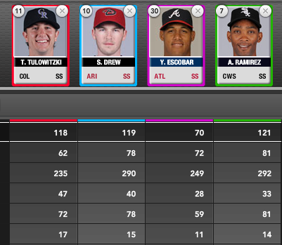 In one league, the Fantasy Lounge Roto Champs League, I’ve won two of the past three years — but my team is struggling a little right now. I drafted Alcides Escobar as my shortstop, and even though it took such a late pick that the rest of my team is reasonably strong (up to sixth from last), I’ve been struggling at shortstop and replaced Escobar with Ian Desmond recently. Someone dropped Stephen Drew the other day, though, so I immediately put in the claim for Drew, washed my hands of Desmond, and felt like my team had just gotten much better.