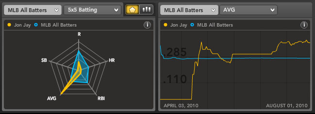 A longer look, though, takes some the shine off Jay’s profile. Jay’s batting average on balls in play is an astronomical .424; even the two biggest outliers last year, David Wright and Ichiro Suzuki, had .394 and .384 numbers in 2009. Also, BABIP stabilizes at .300 around baseball every year. So you’ll see Jay’s BABIP, and batting average, come down significantly as natural regression sets in.