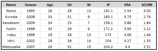 Only 12 pitchers born in Japan have made more than 10 starts in the major leagues. Only nine have made more than 15 starts. Iwakuma will (presumably) become the tenth sometime around the All-Star Break. The nine names to concern yourself with here are Hideo Nomo, Tomo Ohka, Masato Yoshii, Kazuhisa Ishii, Daisuke Matsuzaka, Hiroki Kuroda, Hideki Irabu, Mac Suzuki, and Kenshin Kawakami. Eliminating the pitchers who came up through the minor leagues (Ohka, Suzuki) leaves us with these first full season results: