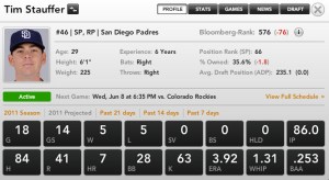 Staying in the National League West, Jhoulys Chacin was a much better pitcher than his 9-11 record showed. The Rockies’ right-hander compiled a 3.28 ERA in his first full season while striking out more batters (138) than innings pitched (137.1). Like many other Colorado starters, Chacin’s ERA at home (3.98) was much higher than his road mark (2.44). Even with regression, he should still be an above-average starter who gets drafted after round 20.