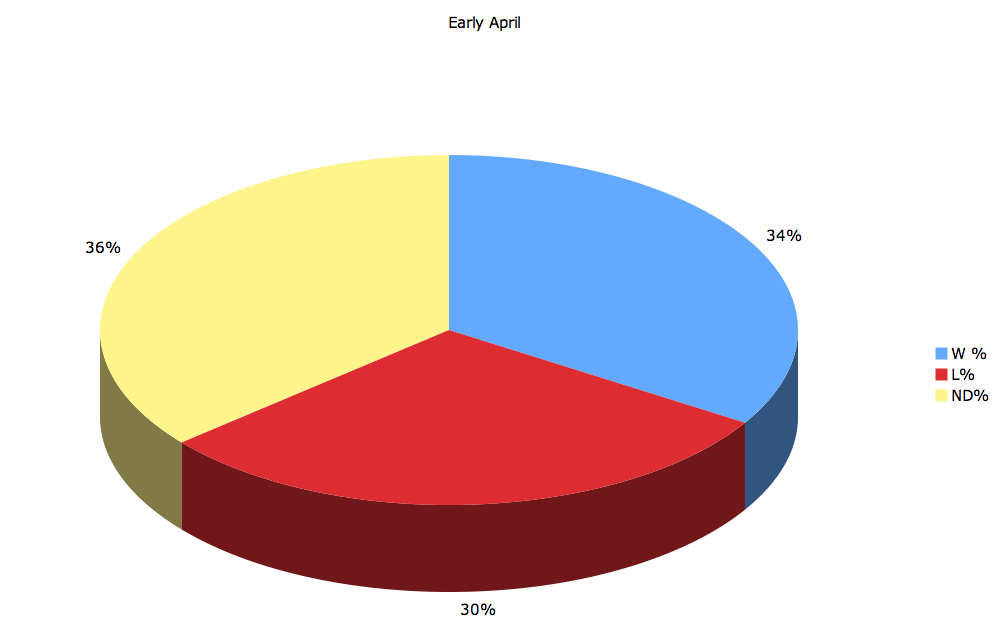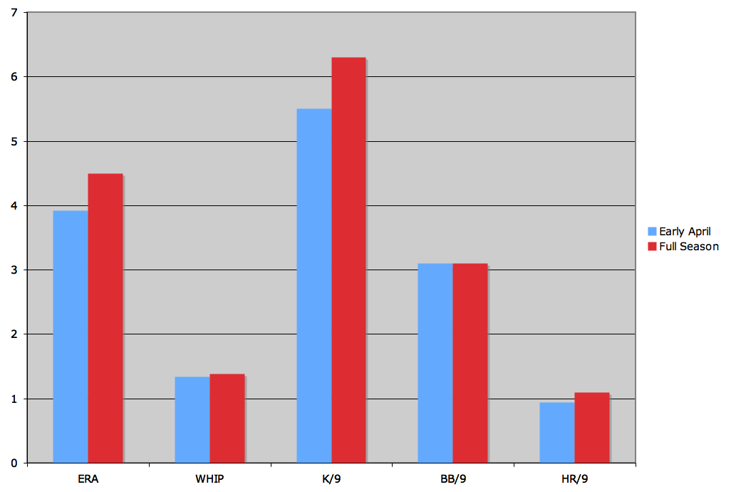 Let’s start with endurance and the potential for wins. We’re shocked to learn there’s hardly any difference at all. Starters in early April average 5.8 innings per game started. Starters average the same 5.8 innings per game started throughout the season. In early April, starters win the games they start 34% of the time. Throughout the season, that only ticks up to 35%. In early April, starters are a little less likely to be on the hook for a loss and a little more likely to be given a no-decision, but unless your league counts those stats, that’s not very important.