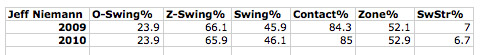 What about swing rates? Take a look at the table on the right, with statistics courtesy of FanGraphs.com. Almost every single swing rate is either the same or marginally worse this