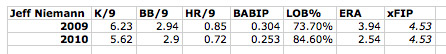 First, the role of luck in Niemann’s career should be charted. Take a look at his underlying statistics and the difference in ERA below. Pretty interesting that a pitcher could be so similar in two years and yet have such different ERAs, isn’t it? The fact that the two xFIPs (a number that strips out batted-ball luck and normalizes home-run rates, then produces a number on the ERA scale) are exactly the same gives you a clearer picture of Niemann’s true ability level.