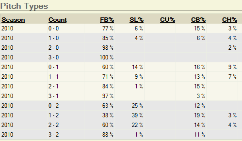 Another major difference from last year to this year is home runs allowed. The rightly allowed just 11 home runs last year in nearly 230 innings of work; his HR/9 was a microscopic 0.43. This year he has allowed 10 long balls – nearly matching his total from a season ago in about one-third of the time. On the other hand, his HR/9 in 2010 of 1.13 is much closer to his career level of 0.97 than the number we saw last year.