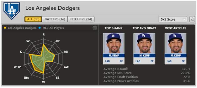 It’s not surprising that the Bloomberg Sports team spider graph identifies Troy Tulowitzki as the best player on the Rockies. His power from a premium defensive position makes this offense hum. Young Ian Stewart has the potential to be a poor man’s Mark Reynolds, and the team has buckets of upside hanging out in the outfield – Seth Smith, Dexter Fowler, and Carlos Gonzalez comprise one of the best collections of young outfielders in the game. Veterans Brad Hawpe and Todd Helton are still there to provide a bridge to all the young talent.